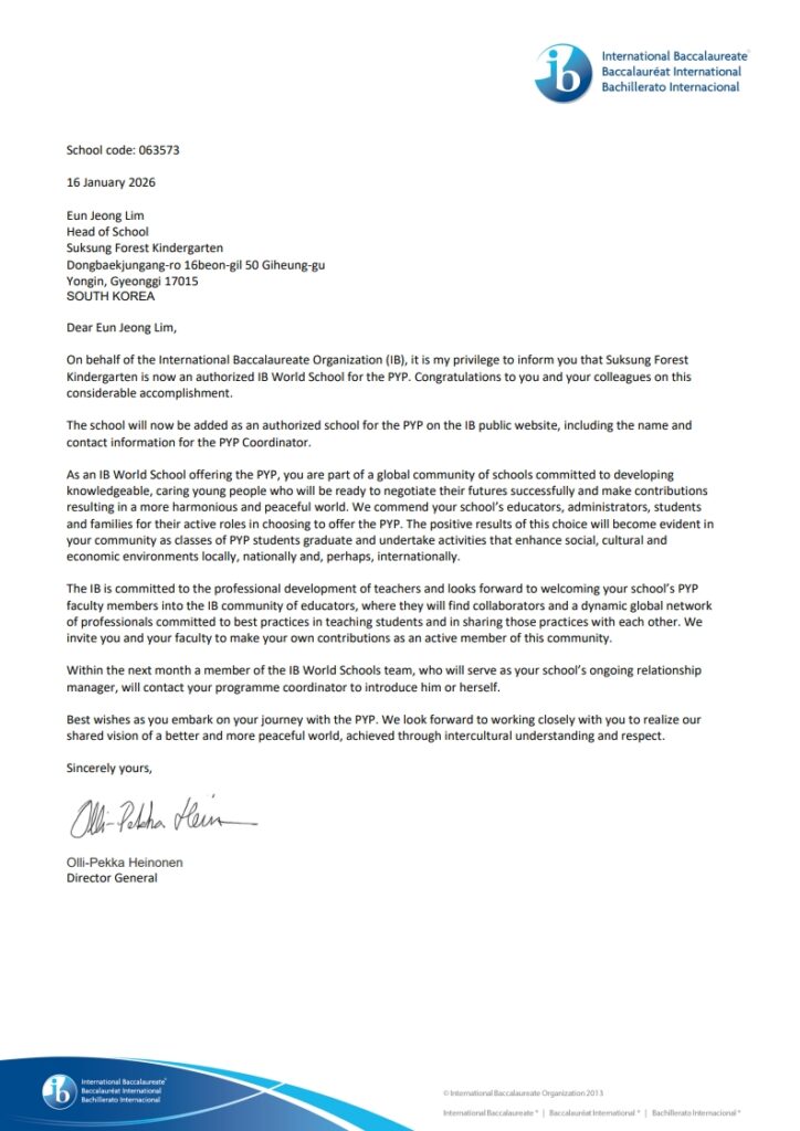 석성숲유치원이 한국 시간 2026년 01월 15일 국내 최초로 IB PYP 월드스쿨 인증을 통과했습니다.